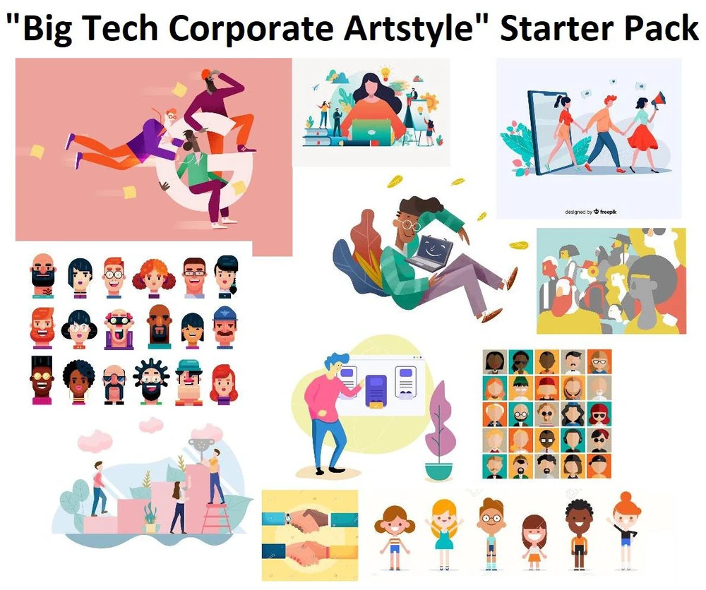 Corporate Memphis1 or Globohomo (global homogeneous) is an illustration style that rose to prominence in the late 2010s in Big Tech software. You probably recognise it. It’s characterised by flat color areas and geometric elements, with human figures rendered in a wide range of hues with disproportionate limbs and minimal facial features.