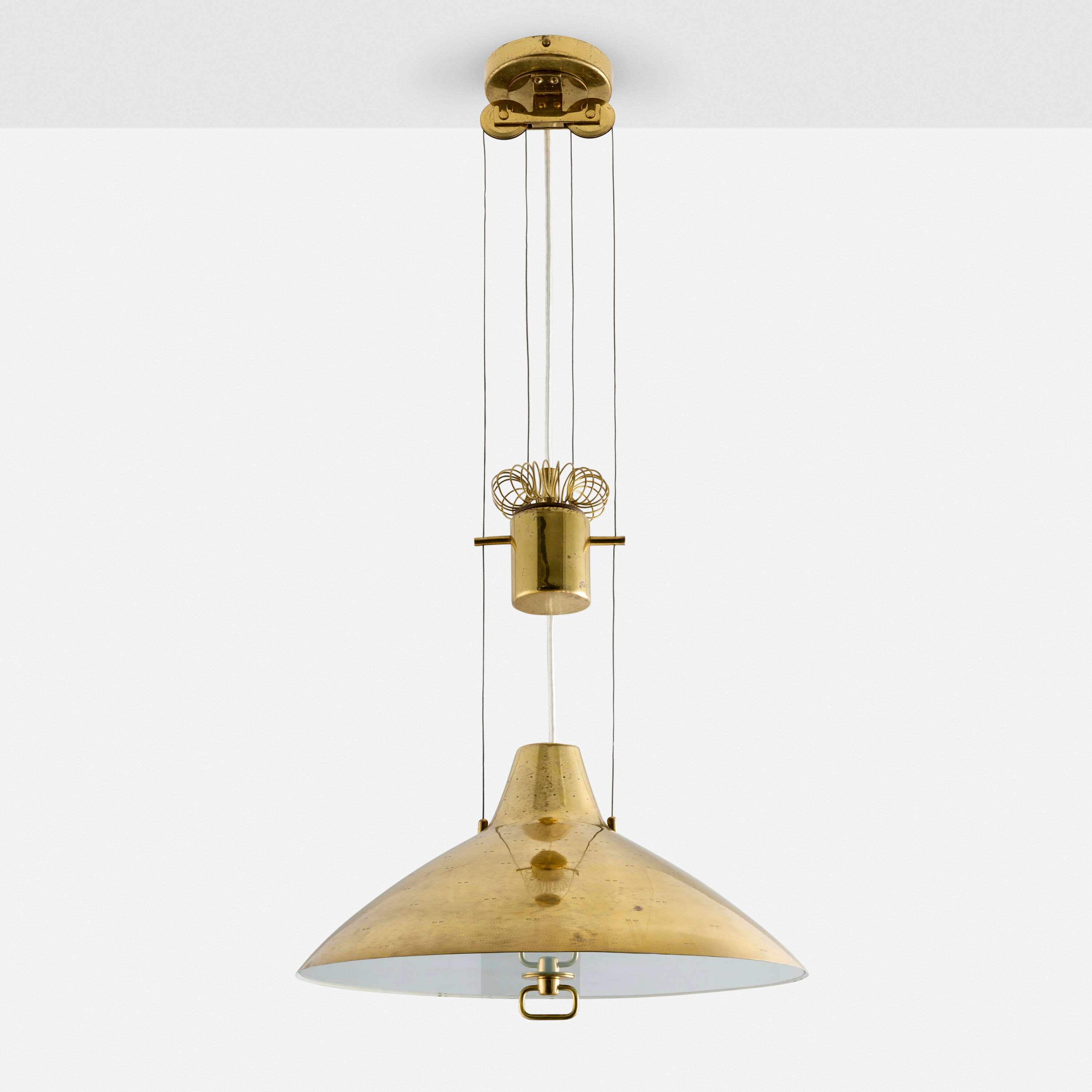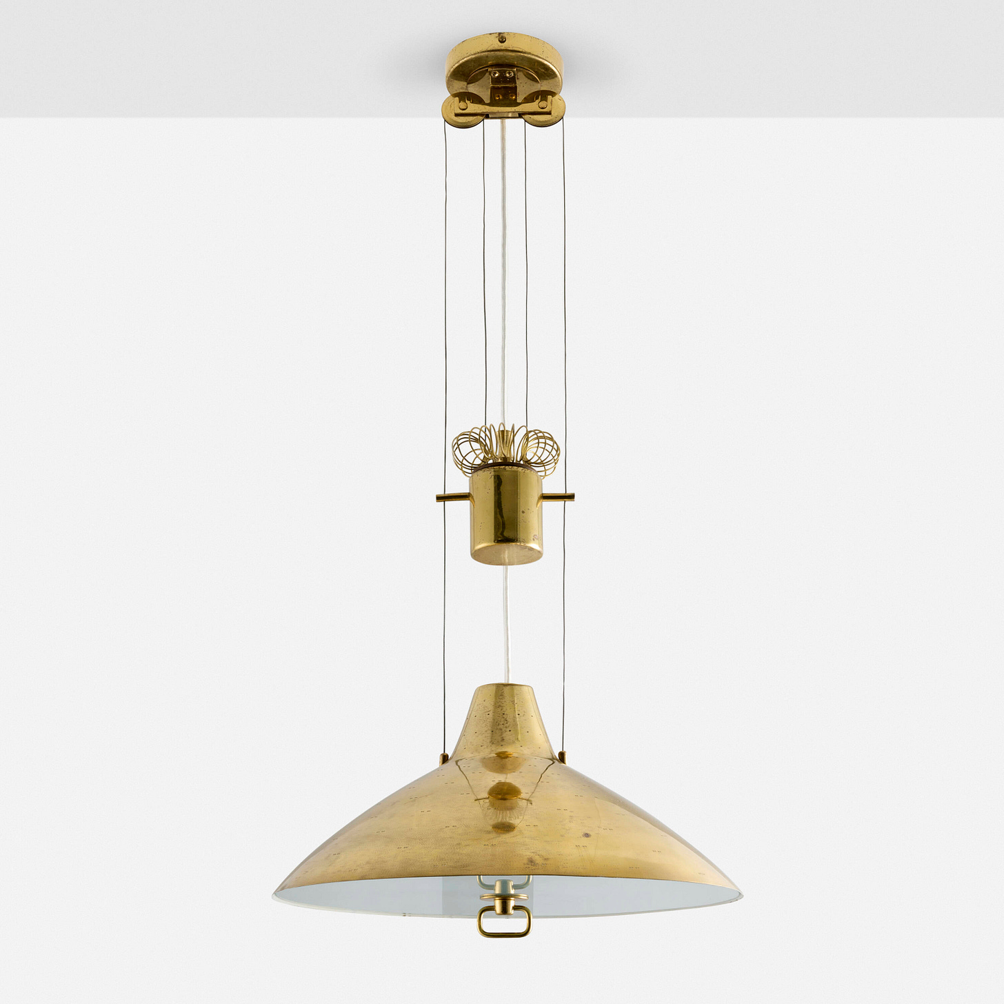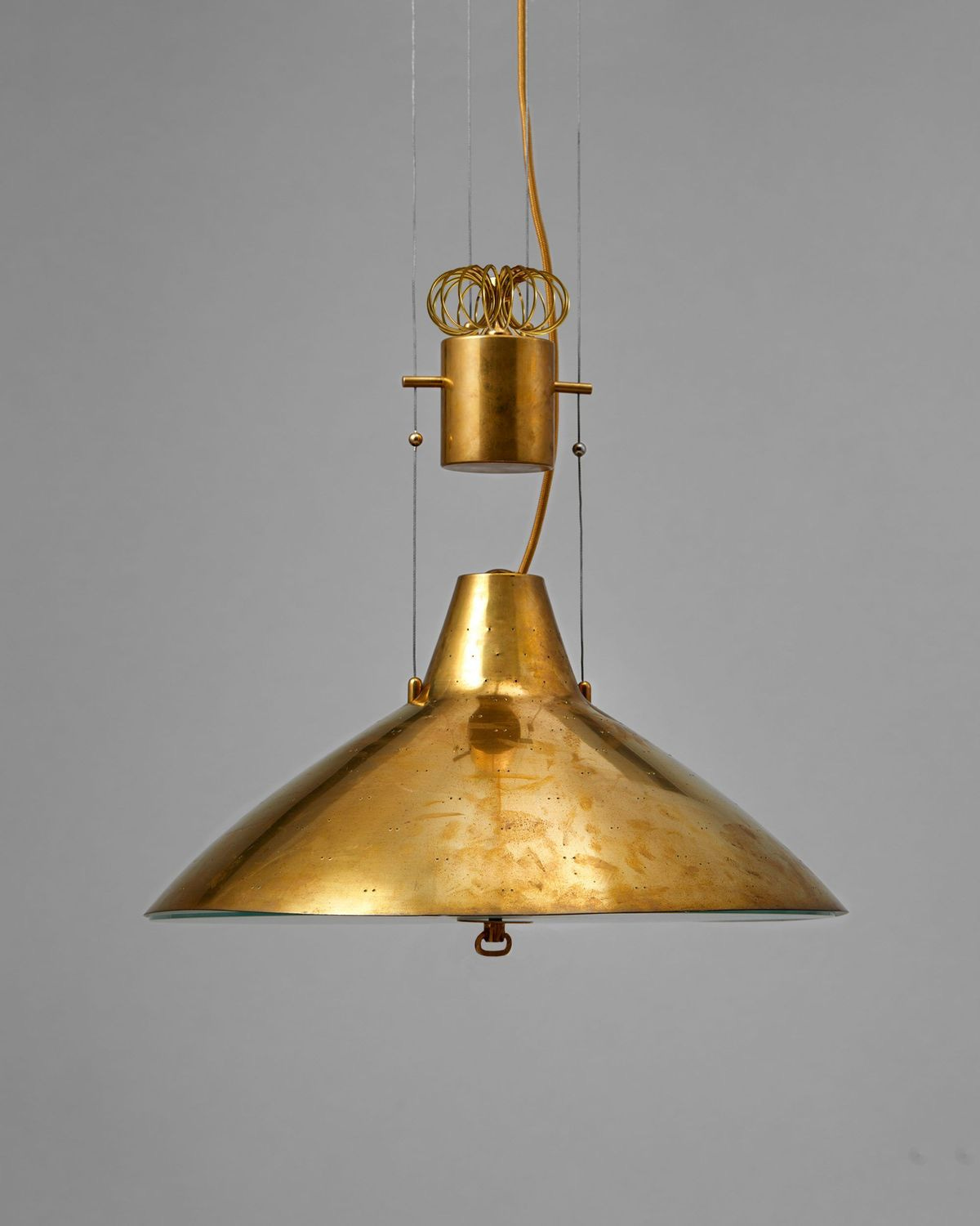 The example I am sharing today by Tynell is known as model A1984, and is a counterbalanced ceiling lamp also in his trademark brass. It was produced by Tynell’s company Taito Oy in the early 1950s for both domestic dining rooms and contract interiors like restaurants that needed height-adjustable light over a table. The counterweight mechanism lets you easily pull the lamp down for intimate, glare-free dining or push it up to wash the room with even illumination from the opal glass diffused electric light.