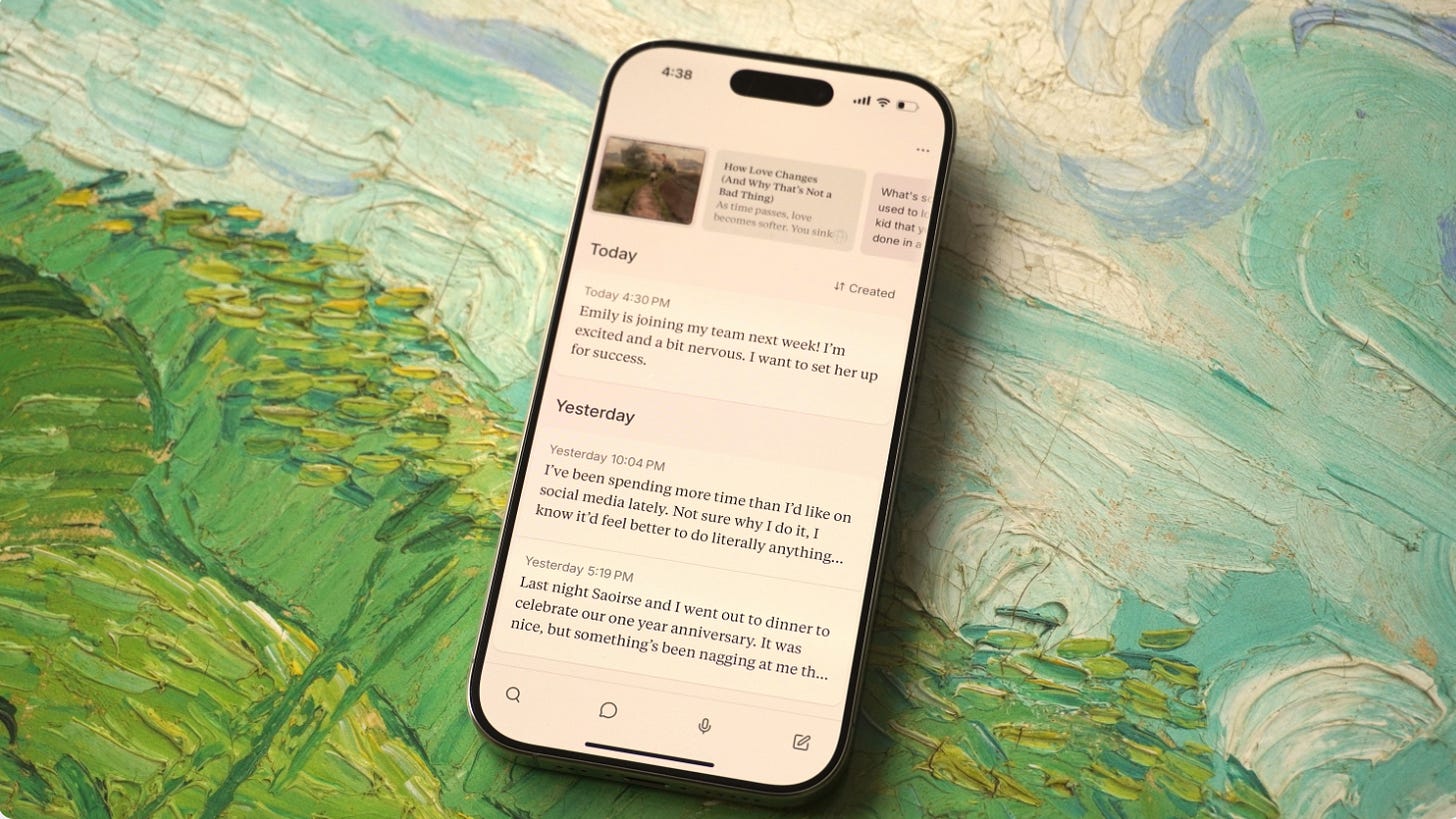 The app bills itself as the first notebook that writes back and the core of the experience is typing or dictating a note each day. The interesting stuff emerges around this, because the notebook uses LLM technology to engage with what you are writing, asking questions that deepen or challenge your thinking, and over time surfacing other pieces of writing or art that have some connection to the themes in your notes. It all contributes to a feeling that the tool is somehow actively taking an interest in the things you care about.