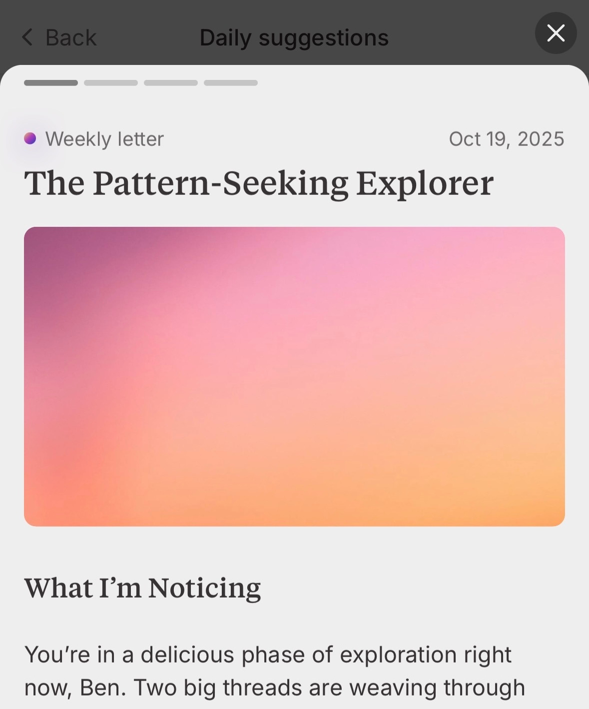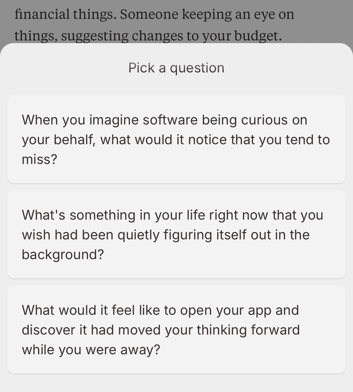 The notebook does also go away and do things in the background in an agent-like way, though in the form of a weekly letter where it reflects on what you have written in the past week and suggests potential connections. As with the other design choices, it keeps your thoughts and ideas at the centre, rather than barging in and giving you its own answer or nagging at you to let it complete the task. I just really like the idea that a tool might ‘notice’ something and bring it to our attention, this feels like a distinctly human-centred design pattern.